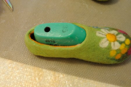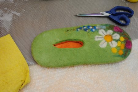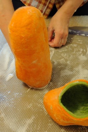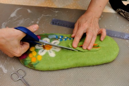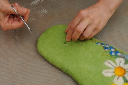 Когда все этапы по валянию пройдены, следует проверить, одинаковый ли размер тапочек получился, если нет – подправить. Если все в порядке, можно сделать небольшое отверстие и достать шаблон.