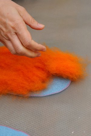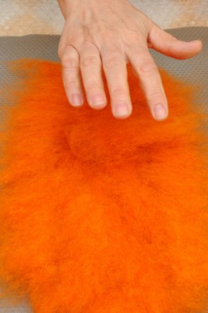 - Фото 5. Работая с кардочесом необязательно соблюдать направление волокон (это важно только, если Вы используете гребеную ленту), главное равномерно распределить шерсть по всей поверхности шаблона.
