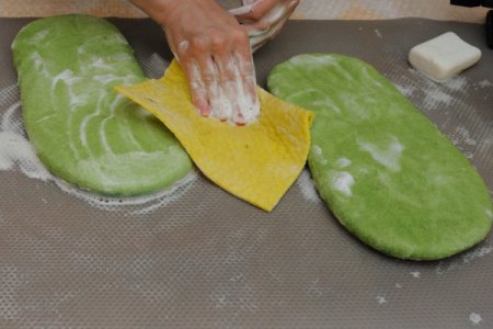 После того, как все слои наложены, нужно намочить тапочки, накрыть и прожужжать немного, повторяя все для двух слоев. Для нашей работы необходимо сделать подобным образом четыре слоя оранжевого цвета, а сверху два слоя зеленым цветом. Обратите внимание, что оранжевый цвет не должен выбиваться из-под зеленого. Для этого его следует немного подвалять. Излишек влаги убирается при помощи сухой салфетки.