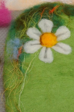 Затем переходим к ромашке, которую сперва следует сформировать в руках, прибивая ее по контуру иголкой. Для этого декора рекомендуем использовать много шерсти, чтобы рисунок получился плотным, а цвет насыщеным. Также следует увеличить размер элементов, так впоследствии они дадут усадку.