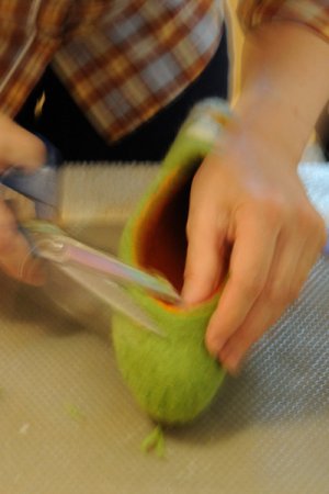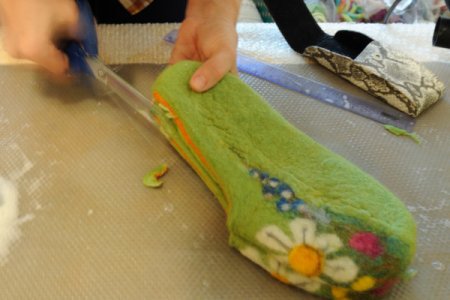 Когда этот процесс закончится, можно обратить внимание на то, как сильно уплотняется и садится изделие. Тапки понемногу расправляем и разглаживаем, после чего следует вырезать отверстие для стоп. Не стоит сразу вырезать большое отверстие, так как в процессе оно еще увеличится.