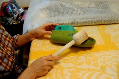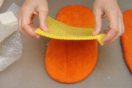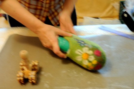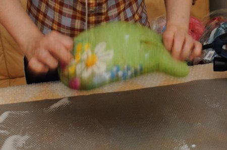 Когда почувствуете, что шерсть хорошо уплотнилась и слои не двигаются внутри. Потрите тапок об икеевскую пленку (или пупырку) в разных направлениях.