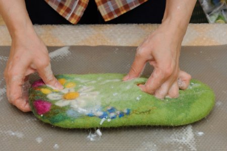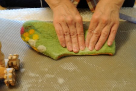 Когда почувствуете, что шерсть хорошо уплотнилать и слои не двигаются внутри. Потрите тапок об икеевскую пленку (или пупырку) в разных направлениях.