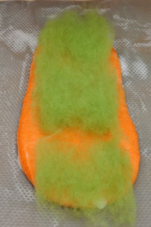 Когда шерсть плотно обляжется по шаблону, можно приступать к раскладке зеленого цвета (раскладываем 2 слоя с каждой стороны).