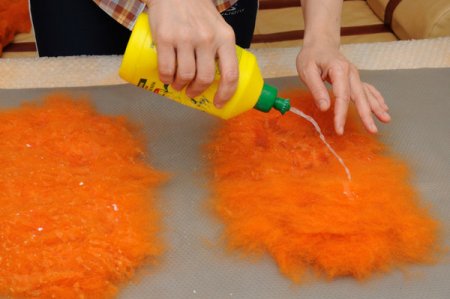 Прикрываем поверхность пленкой и достаточно сильно прижимаем, чтобы влага равномерно распределилась по всей шерсти.