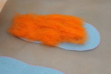Смелыми движениями вытягиваем облако шерсти, расправляем и укладываем вертикально шаблону. Выступаем тонким концом шерсти за край шаблона на пятке и носке примерно на 1,5 – 2 см, а по бокам не выходим.