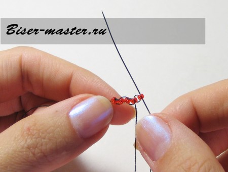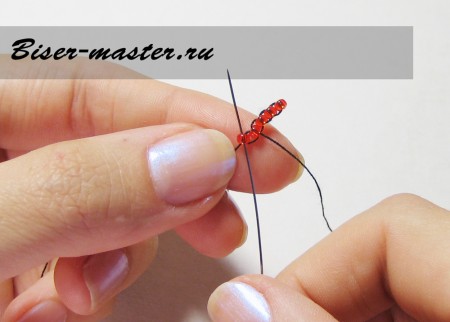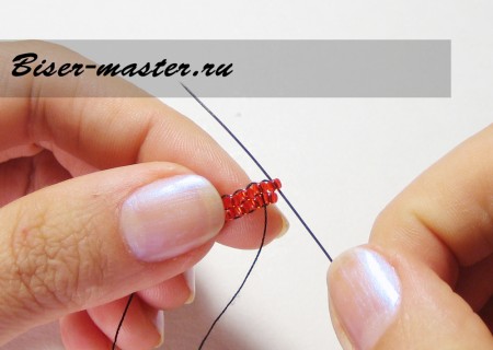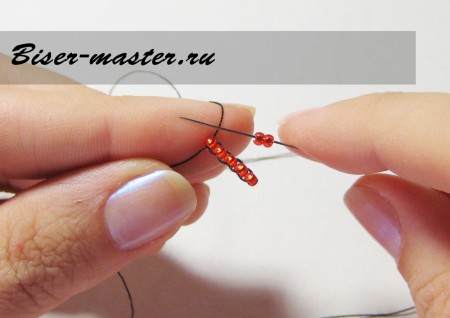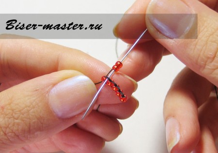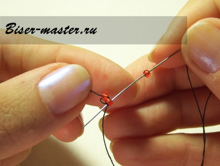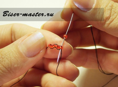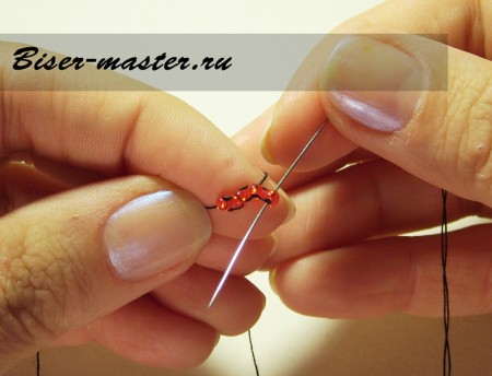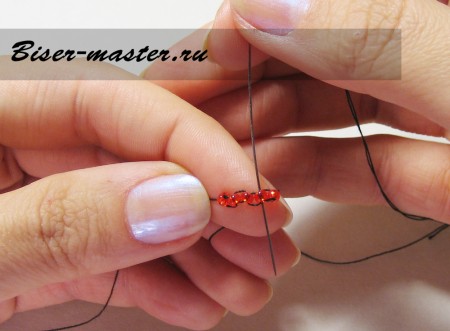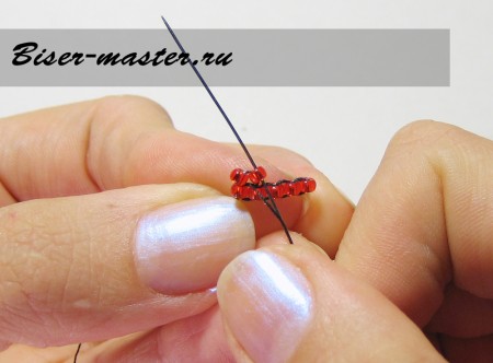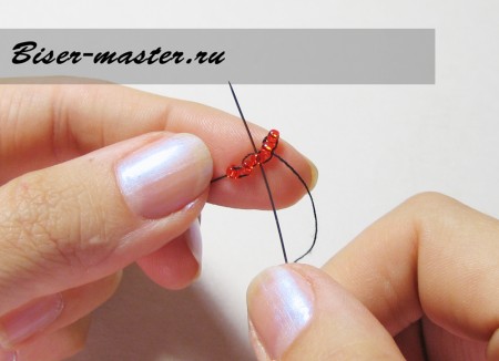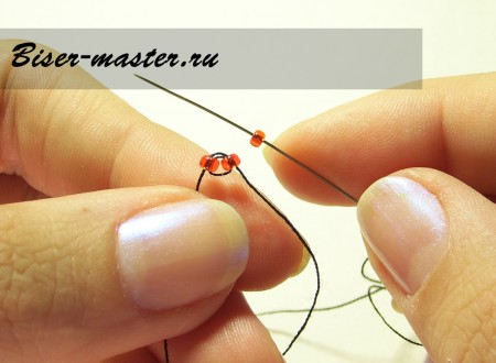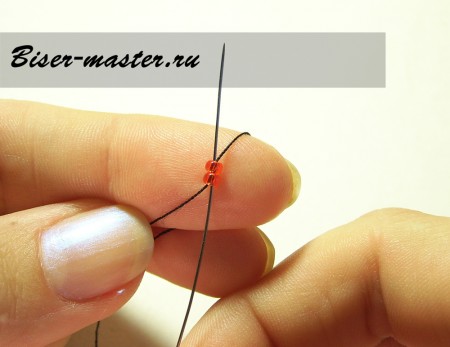 Следующим шагом нанизываем третью бисерину, проводим иглу сквозь вторую бисерину навстречу плетению. На фото показано исполнение данного процесса пошагово.