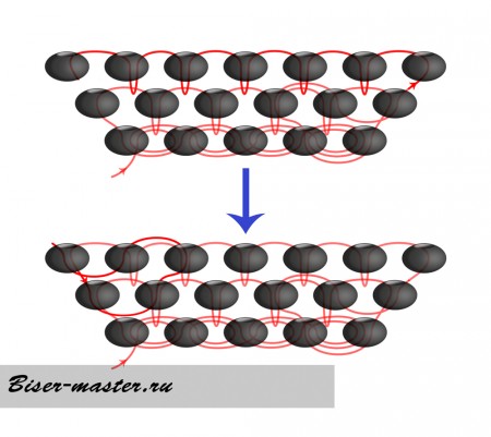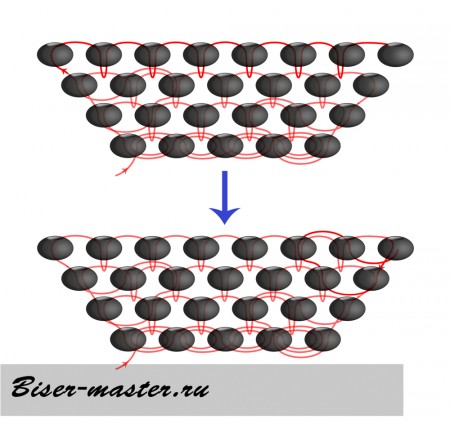 б) если нужно уменьшить ряд в середине плетения, для этого вам нужно две петельки проплести одной бисеринкой, или просто пропустить одну петельку, зацепиться за следующую и проплести.