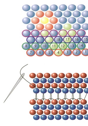 Мы как бы укладываем бисерины и похоже это на то, как лежат кирпичи в стене при строительстве зданий.