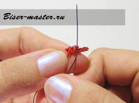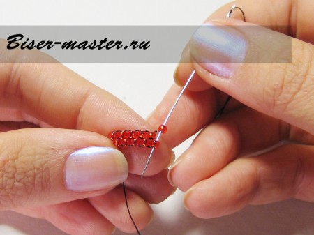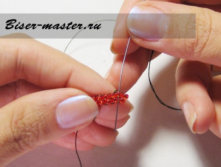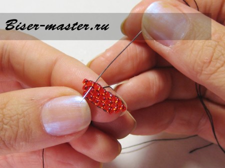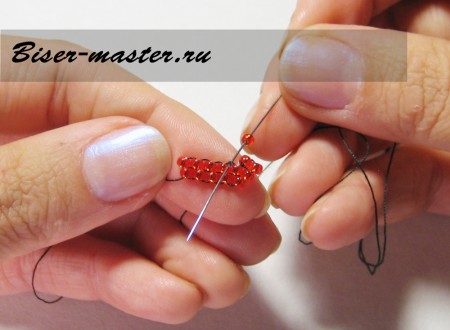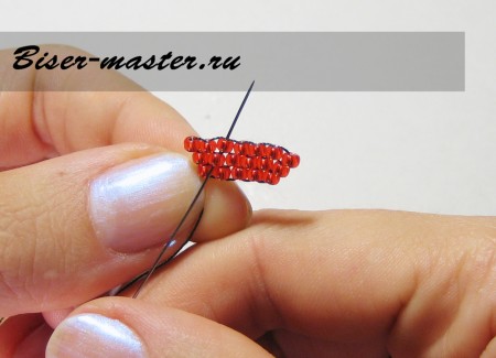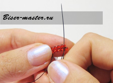 Иголку заводим в петельку предыдущего яруса и выводим через красную стекляшку.