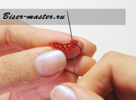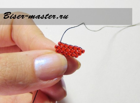 9. И вернитесь сквозь бисерину второго ряда, затяните. Наберите одну бисеринку, пройдите через нить между двух бисерин нижнего ряда и вернитесь через только что набранную бисерину.