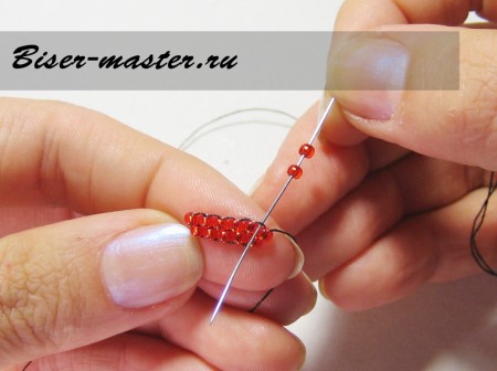 Выводим иголку через набранную бисеринку.