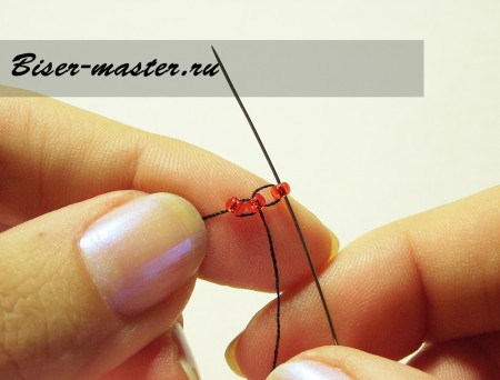 Отодвигаем две бусины и продеваем иголку во вторую бусинку снизу вверх.