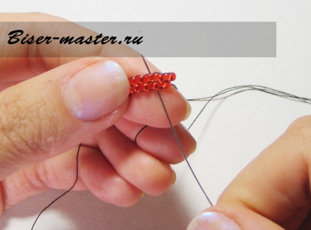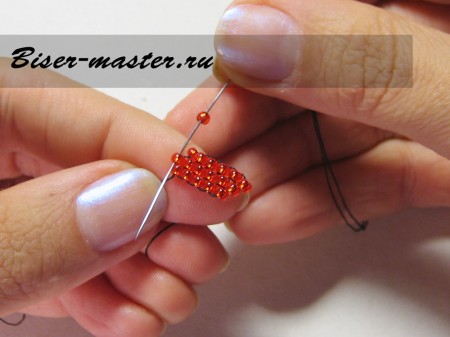 Иголкой проходим через крайнюю бусину первого рядка.