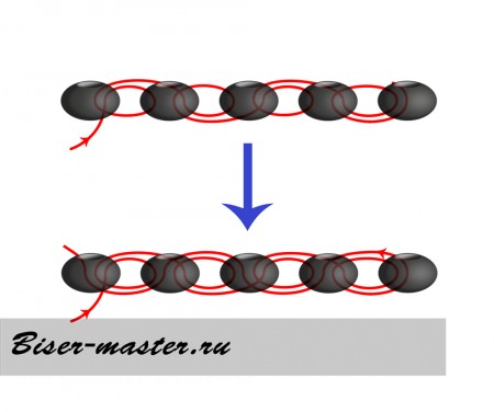 - Для второго ряда к уже полученной цепочке добавляется новая бусина.