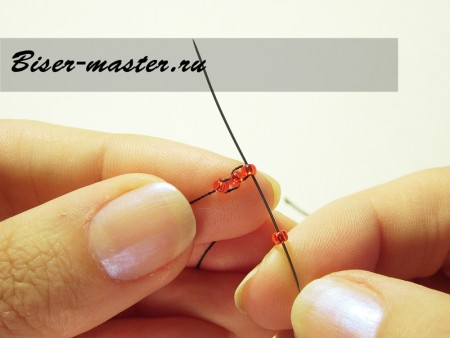 Нанизываем первую пару бисерин на леску.
