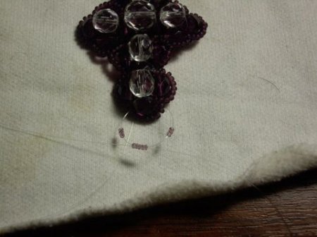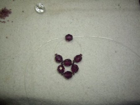 И еще нанизываем одну бусинку на один отрезок, а другим краем проходим через стекляшку, хорошо затягивая мононить посредине.