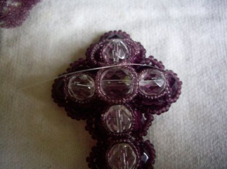 Далее делаем оплетку самого крестика. Тут-то нам и пригодятся бисеринки между бусинами. Нужно будет набирать ровно столько бисерин, чтобы оплетка прилегала к бусинкам довольно плотно. Мы в данной работе будем набирать по десять бисерин десятого номера.