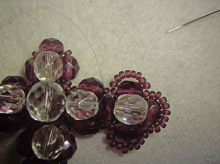 Далее набираем две-три бисерины на каждую сторону и пронизываем их навстречу. После всего набираем тройное такое количество на каждую из сторон и замыкаем бисерины. Далее снова идут две-три бисерины. Мы протягиваем леску симметрично навстречу через бисеринки внизу оплетки у центра.