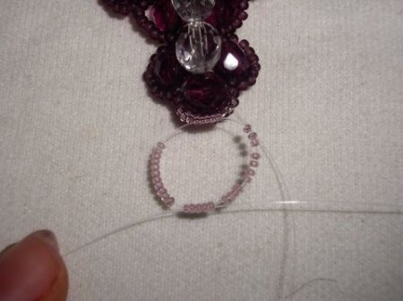 Проходим три бисеринки в уголке, затем набираем 1 бисерину и идем назад на три. Потом нанизываем шесть бисерин и входим в следующую бисерину основы.