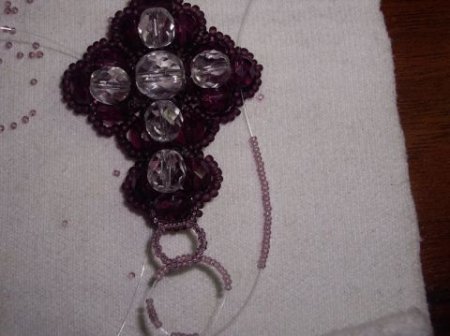 Переходим на верхний луч креста, проходя ниткой через ранее сплетённое. Украшаем мелким бисером этот луч аналогично предыдущему. Дополнительно на вершине креста делаем петельку из 6 мелких бисеринок, для швензы (фото 16). Если крестик предполагается использовать как кулон, нужно придумать другую, более подходящую петельку. Далее переходим на следующий боковой луч, и тоже украшаем его (фото 17).