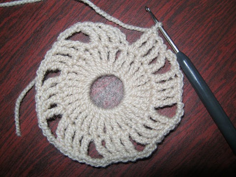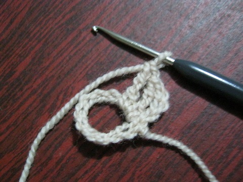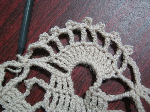 В конце ряда вяжем пять воздушных петлиц и делаем соединительную петлицу, но уже без накида.