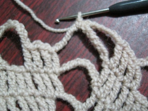 2-й ряд. Делаем такой же подъем, как и в первом. Потом провязываем четыре столбца с двумя накидами. Между столбцами, когда провяжем четыре, набираем еще четыре петлицы, образуя арочку. Затем через одну вяжем опять следующие четыре столбца. Так весь ряд. Затем снова, как в предшествующем рядочке, соединяем между собой. Этим способом мы провязываем до шестого рядочка включительно.