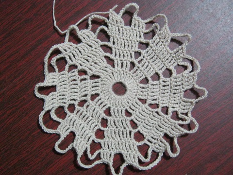 7-й рядок. Делаем пять воздушных, после пятнадцать столбцов с двумя накидами и это все под арку из воздушных предшествующего ряда. Инструмент вводить под саму арочку. Пять воздушных и затем столбец без накида под арочку из воздушных. Повторять до самого конца, но последние шесть воздушных петелек соединить с первой петлицей, которая начинает этот рядочек.