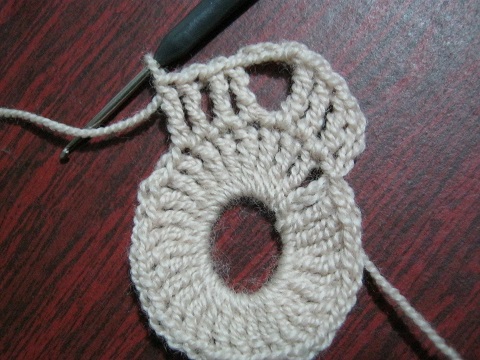 Пропустим столбик, в следующий столбик 1 СБН, пропустите петлю, 7 ССН. Повторяем по кругу.