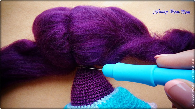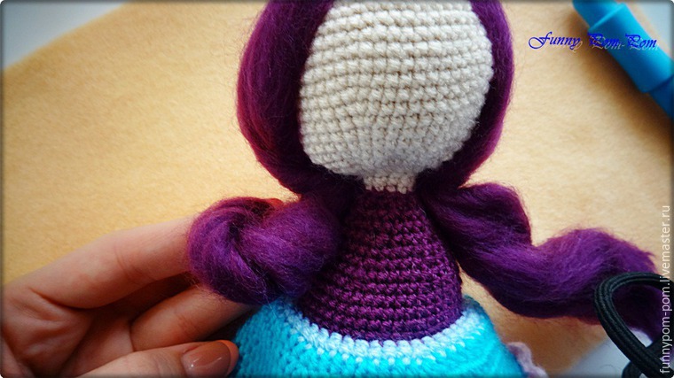 Оденьте эту «шапочку» на голову под наклоном, придав им вид волос, и пришейте по контуру. На этом все.