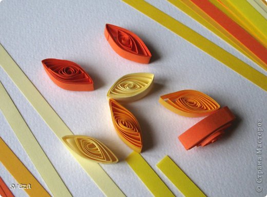 Когда я сочла его достаточным, необходимую форму кленового листа в технике квиллинг «нарастила» желтыми модулями.
