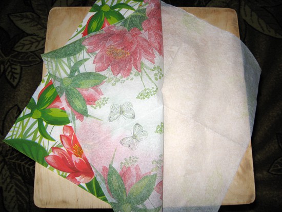 - Довольно часто используют бумажные салфетки. Поскольку эта бумага легче обычной, она может легко сгибаться по углам и с меньшей вероятностью будет пузыриться. Ее полупрозрачная поверхность вполне может сойти за живопись в отличие от других типов бумаг. Вырежьте рисунок, прежде чем разбирать слои салфеток. А затем используйте один слой для декупажа.