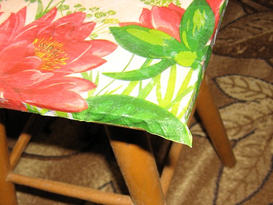 - Салфетку необходимо разделить на слои и применять для декупажа табурета лишь верхний слой с самым чётким рисунком.