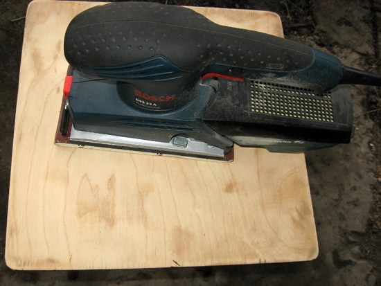 - Тщательно зачистите поверхность табурета крупной наждачной бумагой, а сверху прополируйте мелкой. Если у вас есть шлифовальная машинка, можете использовать её. После этого покройте основу одним слоем грунтовки, дайте ей высохнуть.