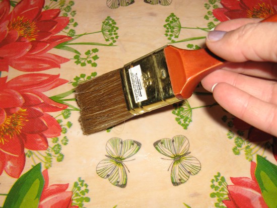 - Поверх грунтовки кисточкой промазываем всю площадь клеем ПВА или клеем-карандашом;