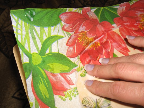 И, как обычно, в декупаже — нанести салфеточный мотив и покрыть лаком.