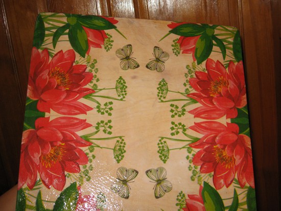 Смажьте сиденье декупажным клеем и аккуратно приклейте салфетку. Разглаживать надо так, чтобы не было складок. Затем нанесите на сиденье минимум 2 слоя лака.
