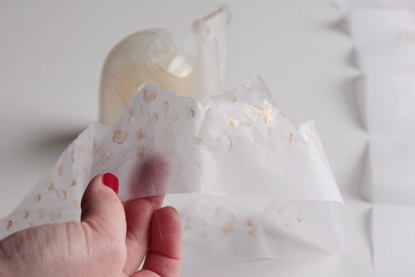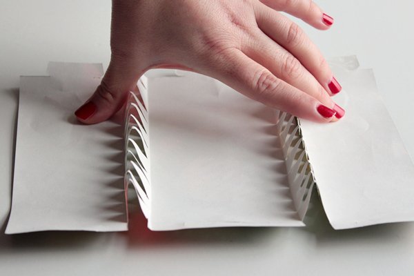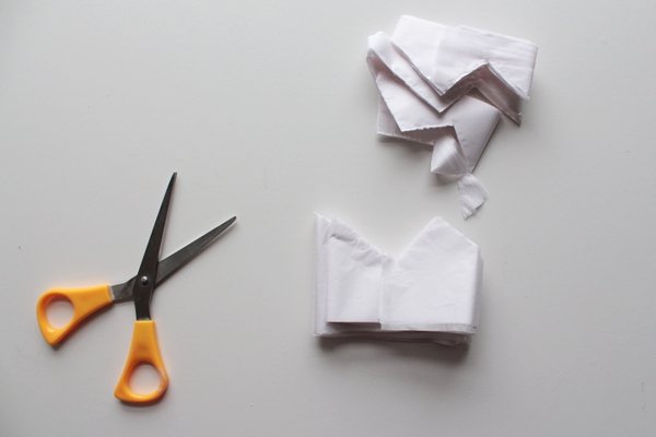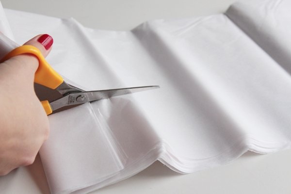 Шаг 6. Папиросную бумагу сложите гармошкой и обрежьте полоску высотой 9 см. Ножницами вырежьте острые углы.