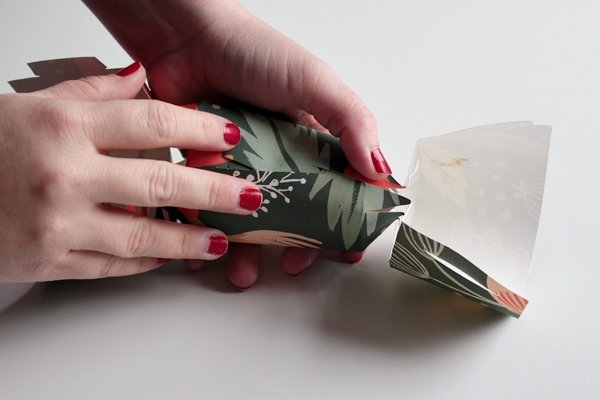 Шаг 5. Получившуюся заготовку для новогодней конфеты сложите при помощи линейки по пунктирными линиям, которые отмечены на шаблоне. Заверните оберточную бумагу, формируя конфету, и проверьте, чтобы все части совпадали, а сама конфета выглядела аккуратно.