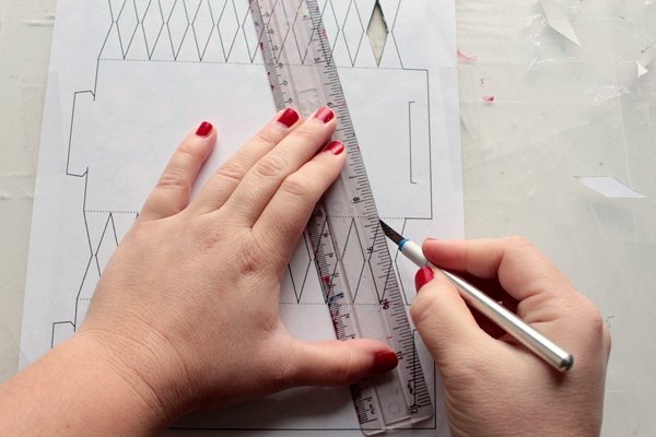 Шаг 4. Используя линейку и канцелярский нож, аккуратно вырежьте все части отмеченные на шаблоне. Это работа кропотливая и потребует от вас усидчивости.