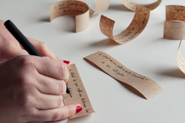 Шаг 9. Нарежьте тонкими полосками крафт-бумагу. Напишите на них пожелания или шутки.