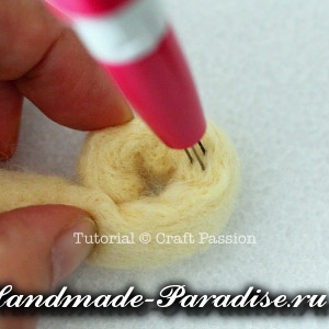 В серединку добавляем немного розовой шерсти. И сделаем маленькие углубления. Для этого посередине несколько раз пройдемся иголочкой.