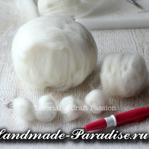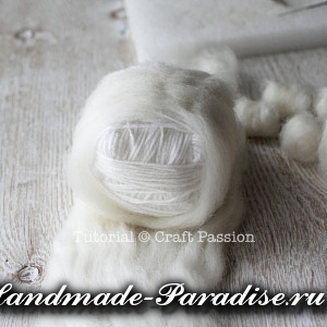 Начнем с валяния туловища. Для этого берем достаточно большой пучок белой шерсти (размер пучка можно оценить по фото, они специально сделаны так, чтобы можно было судить о размерах деталей относительно рук и других предметов). Слегка сваливаем пучок в руках, спутываем волокна.