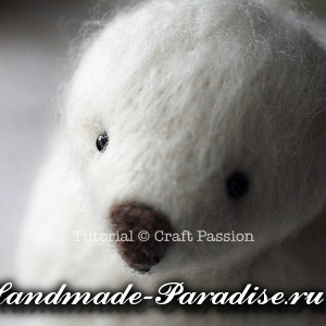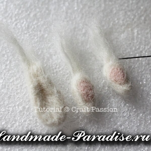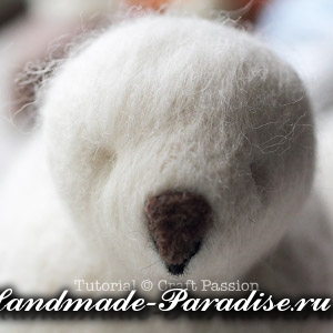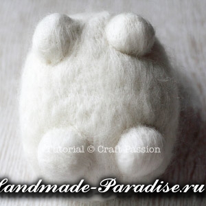 Туловище готово, переходим к валянию головы. Для этого возьмите маленький пучок белой шерсти, спутайте его в руках и на губке придайте пучку форму, показанную на фото. На фотографии же видны пропорции мордочки и туловища относительно друг друга.
