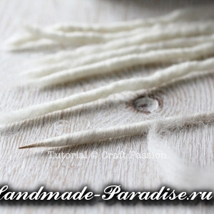 7. Для ножек вытягиваем две прядки шерсти одинакового размера. Мысленно делим прядь на три части и складываем.