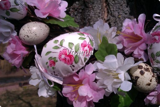 Пасхальный венок на стол. Основа из веток, декоративные яйца, цветы, бантики из атласных лен, мох, перышки, верба
