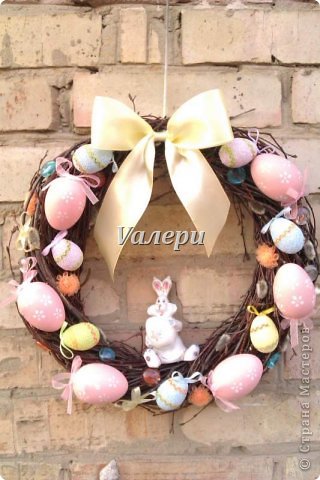 Уже готовый и устраивающий нас по ширине венок закрепляем при помощи шпагата. Украшаем его так, как нам нравится, тут подойдут и украшения, и игрушки, и яйца, ленты, бантики, все то, что нам по душе и по вкусу.