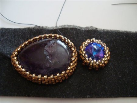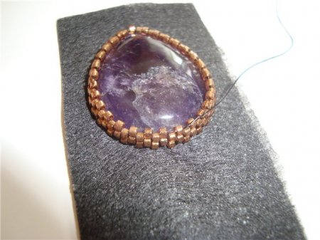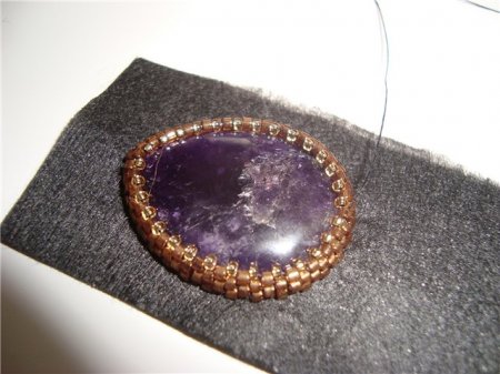 Начнем работу с приклеивания кабошона к основе и обшивания ее Деликой № 11/0.