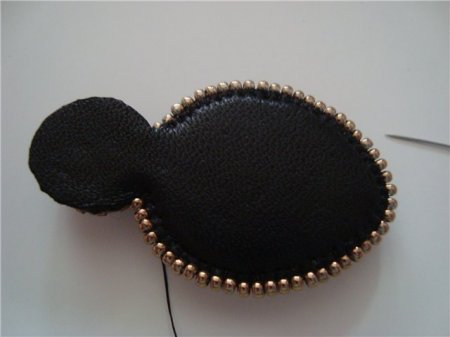Для того чтоб лапки надежно закрепились, внутрь головы капаем немного клея. Затем приклеиваем картон с кожей и прошиваем голову по периметру для дополнительной фиксации. Глаза паука выполняем из биоконусов.