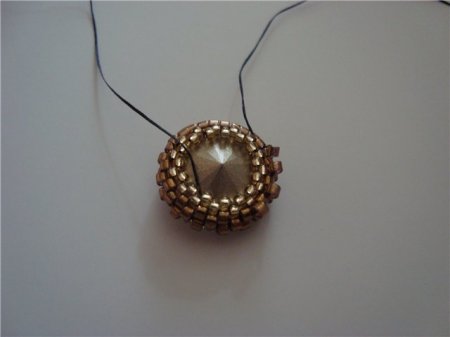 Снизу риволи плетем два дополнительных ряда золотым бисером, которые позже используем в качестве крепления.